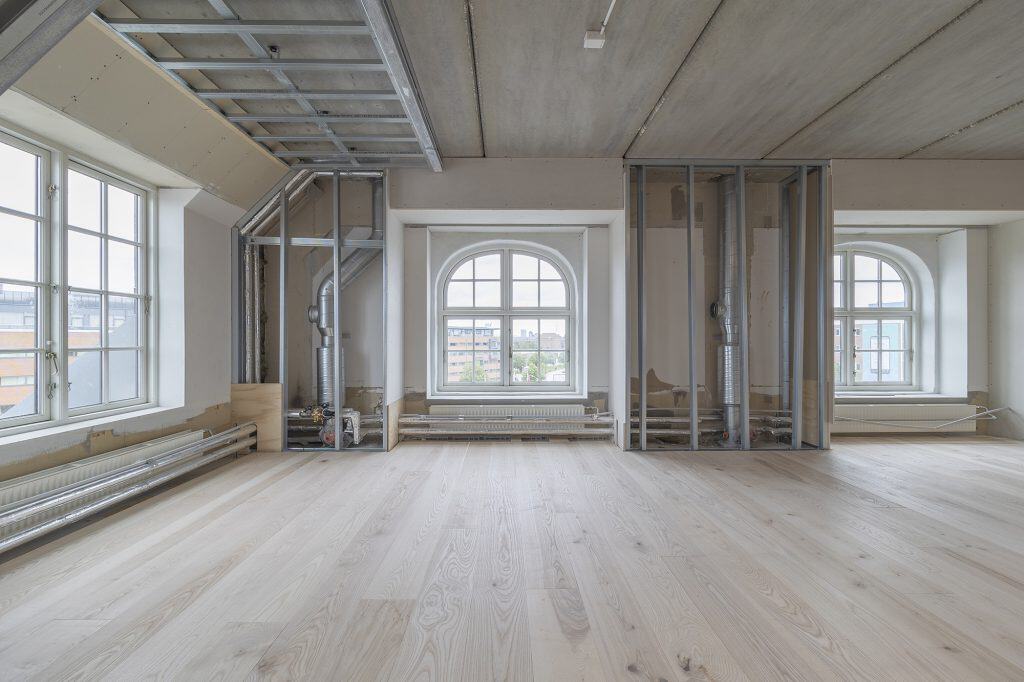 De dygtige tømrere er nu i fuld gang med pålægning af plankegulvet i ask fra Dinesen, og selvom gulvet fremstår ubehandlet i dag, så kan man på stedet se og føle, at valget af netop dette eksklusive plankegulv, er perfekt til ejendommen.
